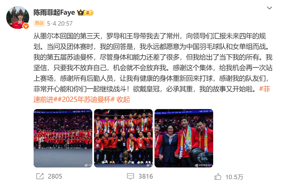 2025年5月4日,还没有完全找回竞技状态,便随队夺得苏迪曼杯的陈雨菲,在社交媒体上写了一段文字,其中写道:“我坚信,只要我不放弃自己,机会就不会放弃我……欲戴皇冠,必承其重,我的故事又开始啦。”